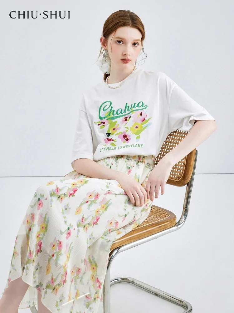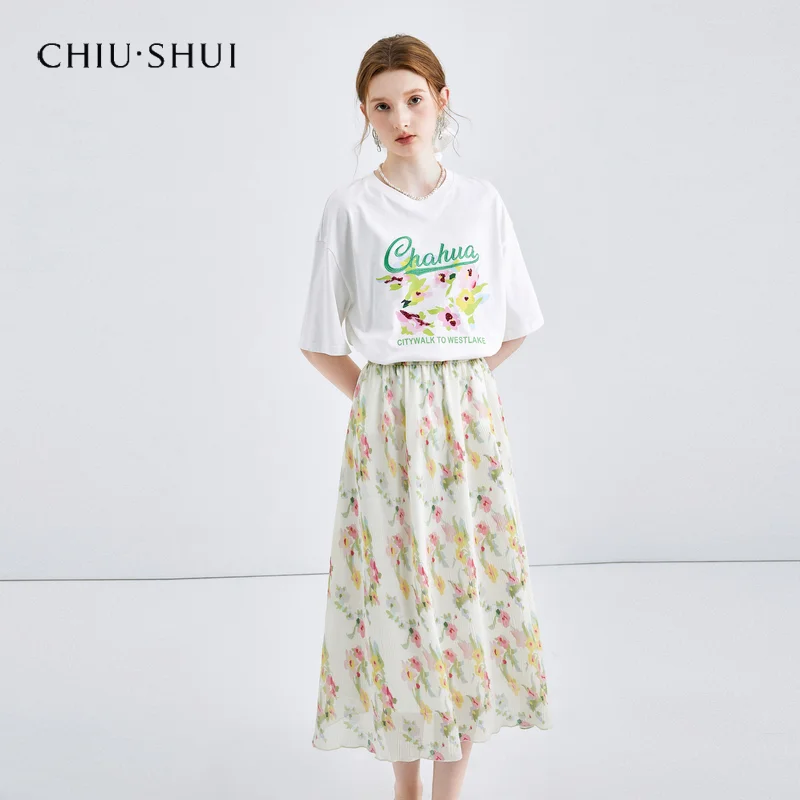 New Women's All Match Two-Piece Set Pure Cotton Short-Sleeved T-Shirt and Floral Skirt Collection